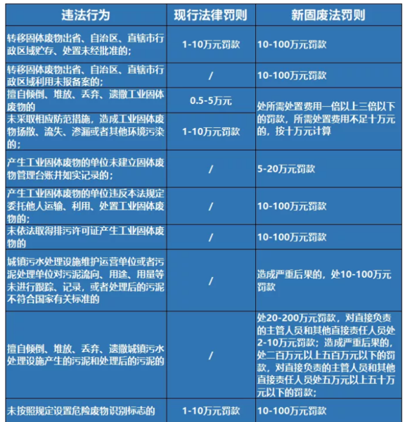 新固廢法普遍提高了對(duì)違法行為的罰款金額幅度,具體見(jiàn)下表: